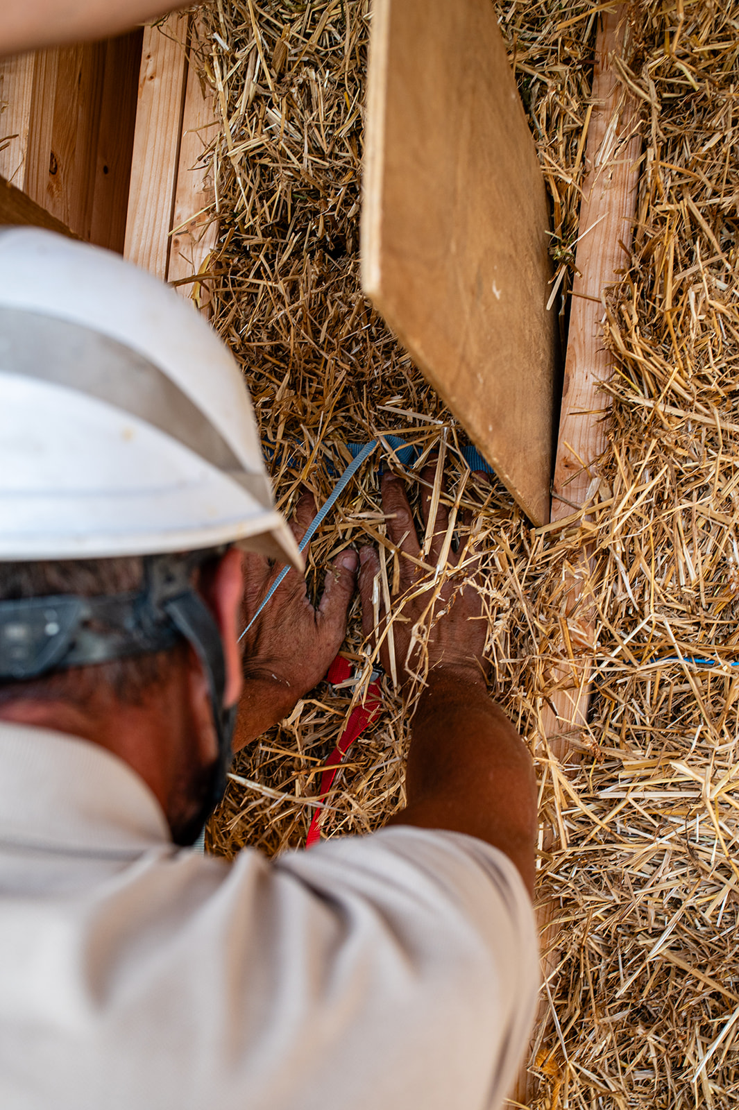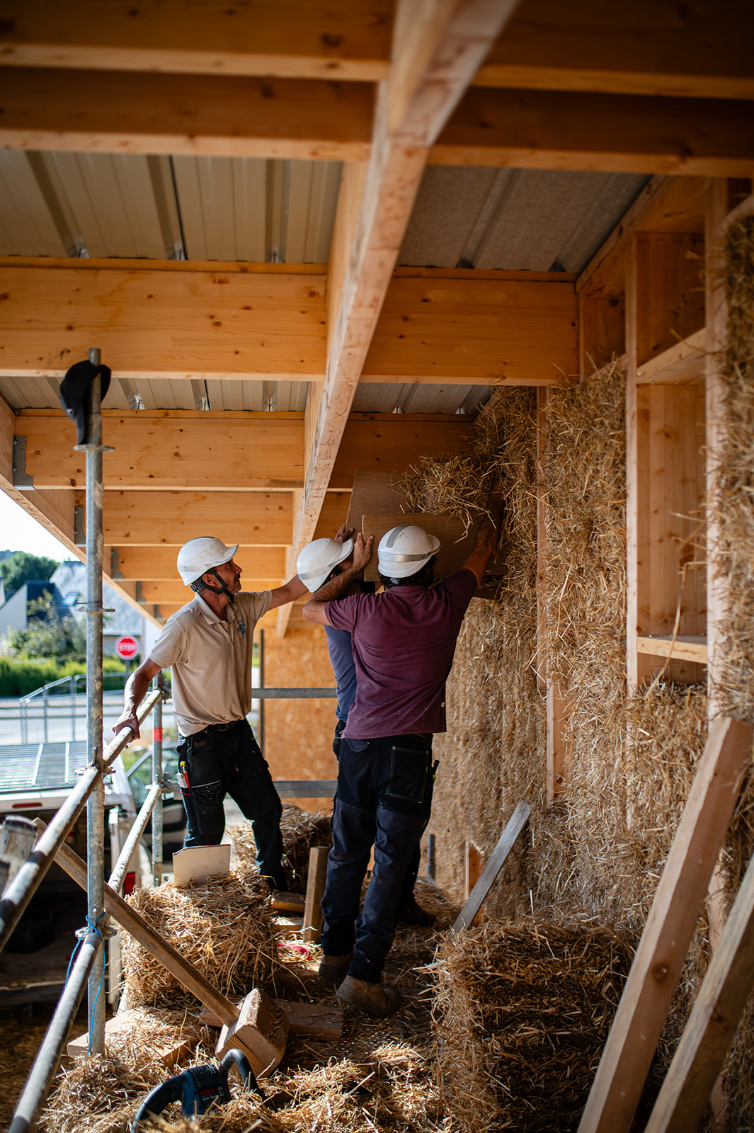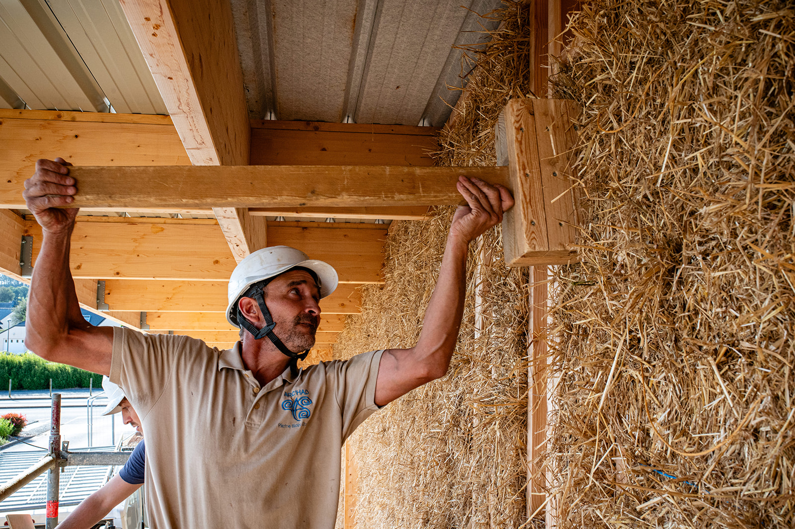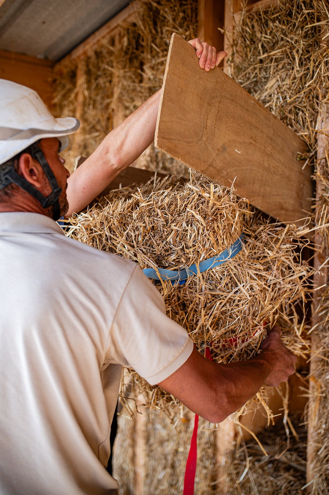En utilisant uniquement des matériaux biosourcés et favorisant les ossatures de doublage en bois (douglas).